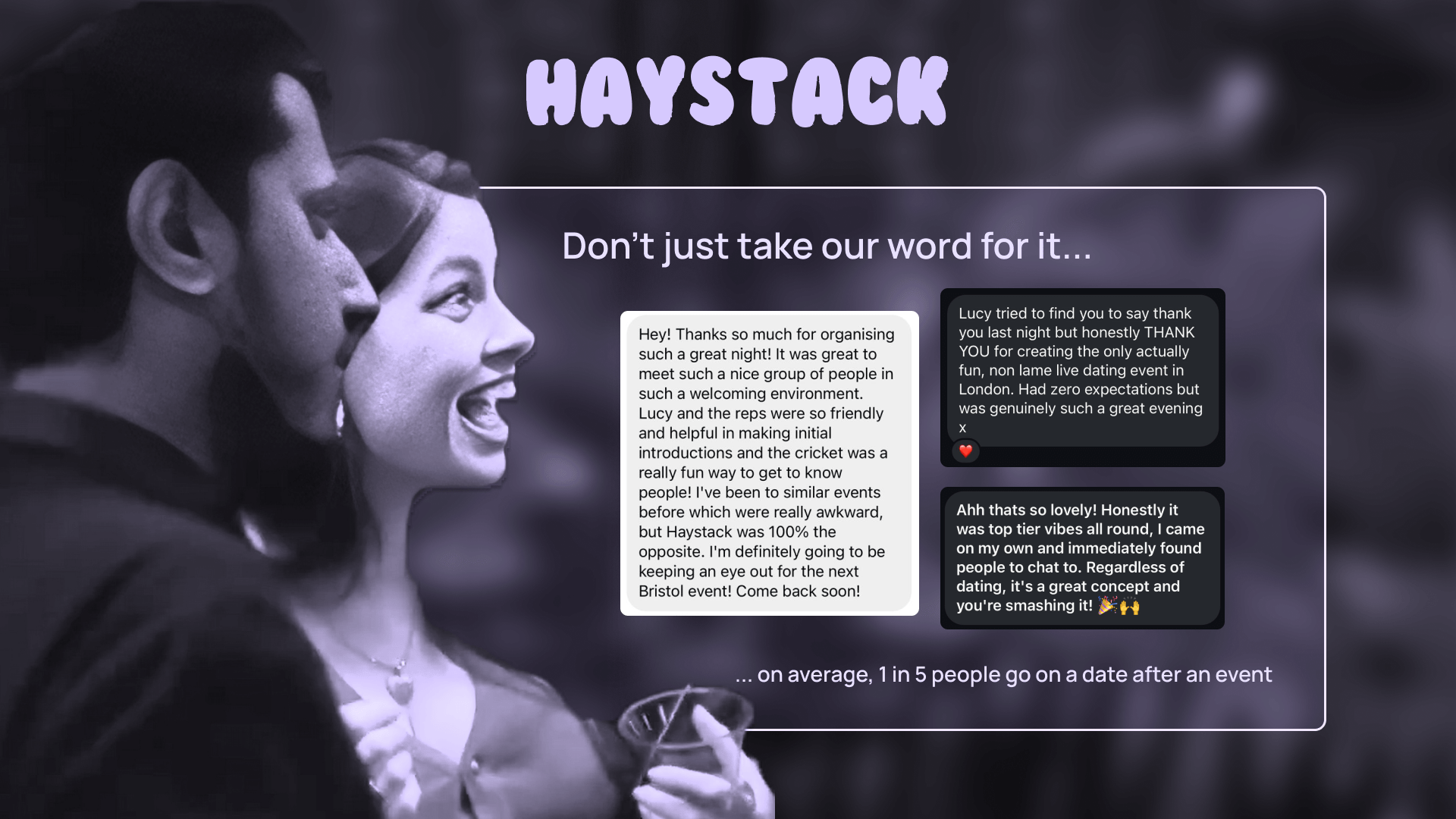 **By attending this event, you agree that Haystack Dating may capture photos and videos for use in our marketing (including social media, website, and promotional material). If you’d rather not appear in any content, just let a member of our team know when you arrive and we’ll do everything we can to keep you out of frame**
